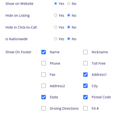 In order for a location to appear in this drop down, it must have address information toggled to show on the website from the location library. Under the basic information for the serving location in the location library, make sure that the show on website setting is set to yes and that there is some address information toggled to show in the show on footer settings.