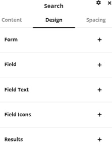The design tab gives a variety of options for customizing the stylings of the search bar and the name links that drop down as a user searches. Properties like color, size, font, border and spacing can all be customized.