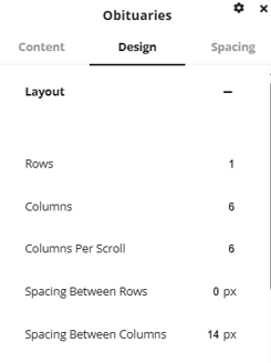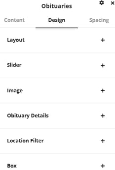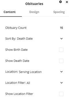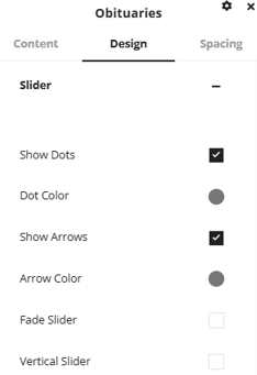 Under the content tab there are a number of options to change what obituaries will display. Obituary Count will allow you to set the maximum number of obituaries that will be added into the slider. Sort By will allow you to set how the listed obituaries will be sorted, Death Date, Service Date and Created Date are all options available for sorting. There are also options available for displaying birth and death dates, toggling the slider to only show obituaries from specific locations or to add a location filter to the slider for the user to use.