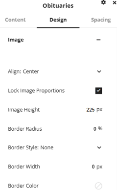 The image area allows you to customize how the obituary images appear in the slider. In the image settings you can set how large the images are, if they have border, how they align or if there is a hover effect when the user hovers on the image.