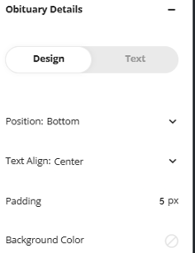 The obituary details area allows you to customize how the obituary information displays in the slider. Options are available to toggle where the information displays around the photo, how the text is aligned, if there should be padding on the text or changing background color.