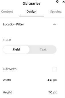 The location filter area gives you options to customize how the location filter field and the text that displays in the location filter dropdown displays. There are options to customize the size, alignment, border and color of the location filter.