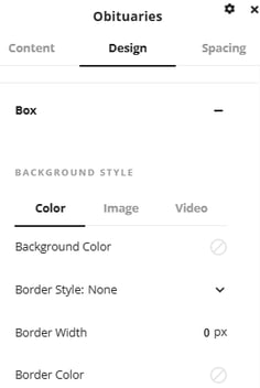 The box area gives options for customizing the box that the obituary slider is contained within. Options are available to make changes to the background color and border. Images and videos can also be set as the background to the slider.