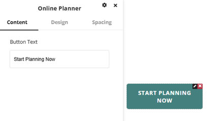 The online planner element adds a button to the page that links to the online planner page on the website. Options are available in the settings window to customize the button text along with options to customize the button styling and spacing.
