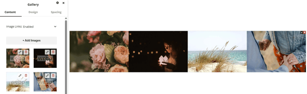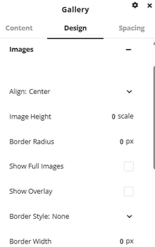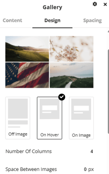Under the design tab there is a number of options available for customizing the layout and design of the gallery. Number of columns can be set to change the layout of the gallery images and spacing can be set between images to create gaps in between.
