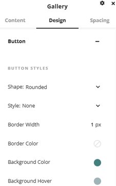 The button area has options available to customize the styling of buttons that are added over the gallery images via. Buttons can be added by going into the edit image area in the settings window and entering button text and a button link.