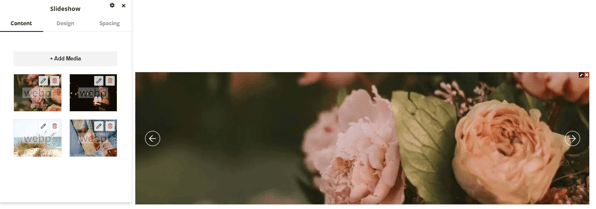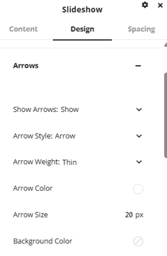 The slideshow element adds a slideshow of images to the page. This elements functionality is very similar to the gallery and image elements but the images will display in a slideshow format either automatically rotating through the images or with the option to add arrows to manually click through the images.