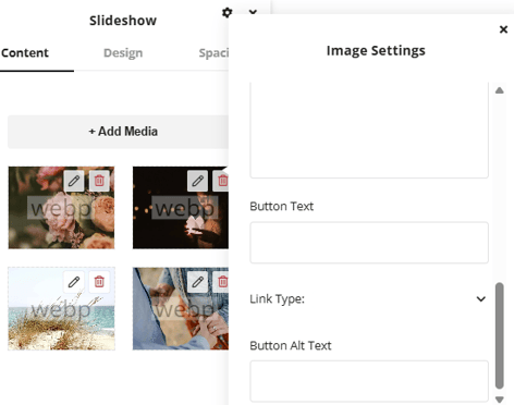 Images can be added by clicking the add media button. Any images that are added can be edited by clicking the edit pencil icon over the images in the setting window. This is where there will be options for adding text and buttons to display overlaid on the images that can be linked.