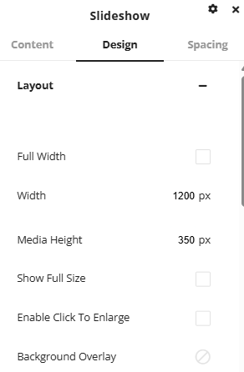 Under the design tab there are various options for customizing the layout and styling of the slideshow. The layout area gives options to customize the width and height of the media along with options for background overlays and borders.