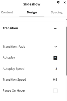 Under the transition tab there is options to customize how the images transition between each other and an option to enable auto play. Settings like the speed of transition and fade styles can be set here.