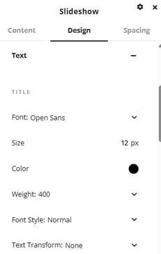 The text area gives options for customizing the font stylings of the text that displays on the slideshow, there are options in this section for changing the size, color and spacing of the font.