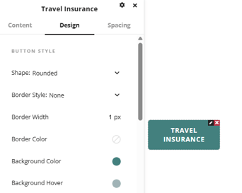 The travel insurance element adds a button to the page that links travel plan options for Inman, our partnered travel insurance provider. The link for this button is preset and the settings window provides options to customize the design of the button properties such as shape, border, color and text customization options.