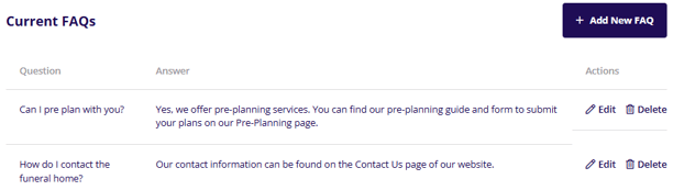 To add a question, you can click the Add New FAQ button at the top of the section. To edit or delete questions, you can use the edit and delete button under the actions column.