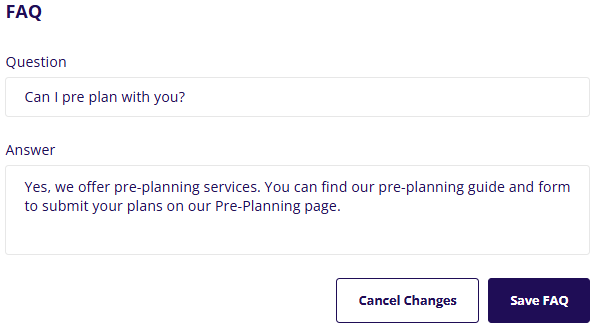 When adding or editing a question, you will be asked to provide the question and answer you want to add. Once you have all the correct information added, make sure to click Save FAQ to save your changes in the system.