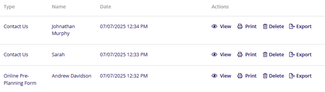 The form submissions section will show all website form submissions from the various forms displaying on the website.