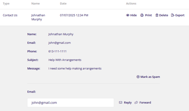To view a submission, click the View button in the actions column. The submission information will be displayed in full along with a few options. If the submission is spam, you can click the Mark as Spam button to mark the submission as spam. The email area is where you can add an email address to forward the email to via the forward button. Alternatively, you can also click the reply button to open the submission in your email software to reply to the user.