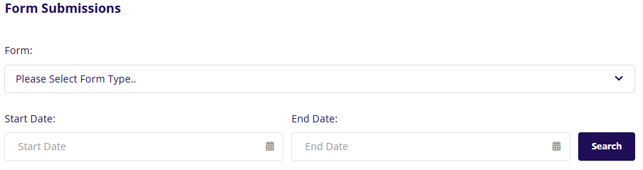 To search through the submissions and fine a particular submission, sorting options at the top of the page are available. You can select the specific form the form drop down and set a start or end date for the search.