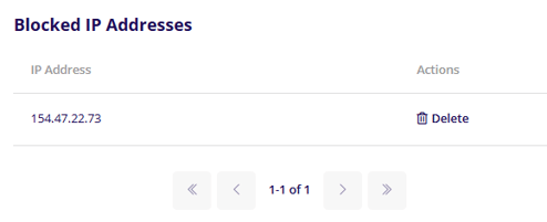 The Blocked IP Addresses section at the bottom of the page will show any IP addresses that have been blocked or marked as spam. If you wish to remove one of these IP addresses from the list, you can click the delete button under the actions column.