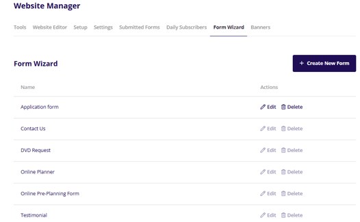 The Form Wizard is where you can see all the website forms that are in the system, along with options to create and edit custom forms.