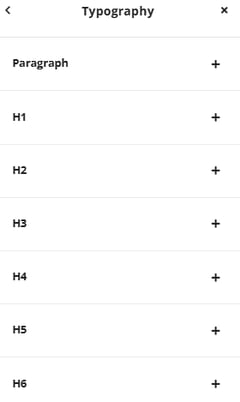 The typography section is where changes can be made to the font stylings of all the different text categories in the system. Paragraph text is the text that shows in paragraph boxes on the site for example or H1 - H6 text is headline text of various different sizes with H1 being the largest. Sections are also available for text link and list item text.