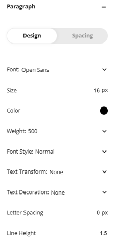 Clicking on one of the categories will open the customizations for that category of text on the website. There will be number of customizations you can set for font type, size, color and letter spacing. The spacing tab can also be selected to view spacing options for text under this category.