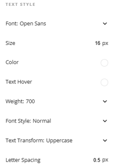The text style options are where you can make changes to the text that displays inside buttons across the website. There are a variety of options to customize the font, size, color, style and letter spacing of this text.