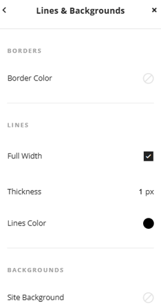 The lines and backgrounds section is where you can make changes to line breaks and overall site background. In the borders area you can set a default color for all borders, the lines area lets you customize thickness and color defaults for line breaks on the site and the backgrounds section lets you set a default color for row backgrounds.