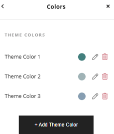New theme colors can be added by clicking the add theme color button. Clicking the color on the theme color will allow you to change the color that is selected and the name of the theme color can be changed by clicking the pencil icon.