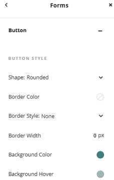 The button area gives the ability to set default stylings for the form button shape, color, style and spacing. The text style area gives options for customizing the default font, size, color and style of the text that display in form buttons.