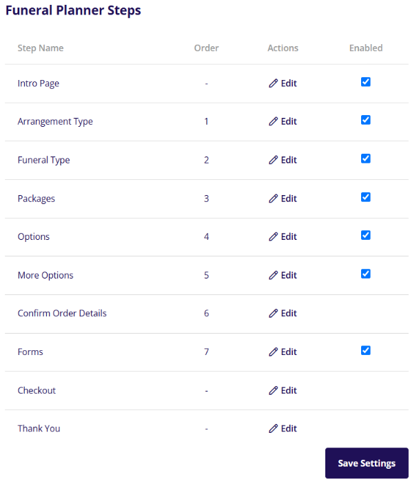 The funeral planner steps section is where you can set up the different tabs and steps of your online planner. These different steps in the planner will contain various pieces of information and selections to be made by the user as they progress through the planner.