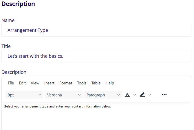 The arrangement type step allows for the selection of the type of arrangement. The description at the top is where you can name the step and then add the title and description information that will show on the page to the user.
