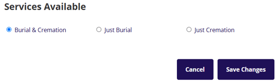 Under the services available section, the option for the what type of service can be selected. Both the burial and cremation options can be displayed or only one of the two options.