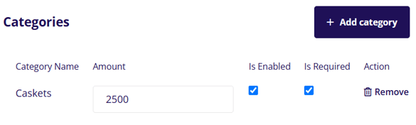 The categories section is where you can add a category of item to be added as part of the package. To add a category click the add category button. A drop down menu will show that contains the different categories that you have available in your merchandise page. Once you add a category, you will have the option to set the amount for that category and you can toggle if this category will be enabled or required on this package.