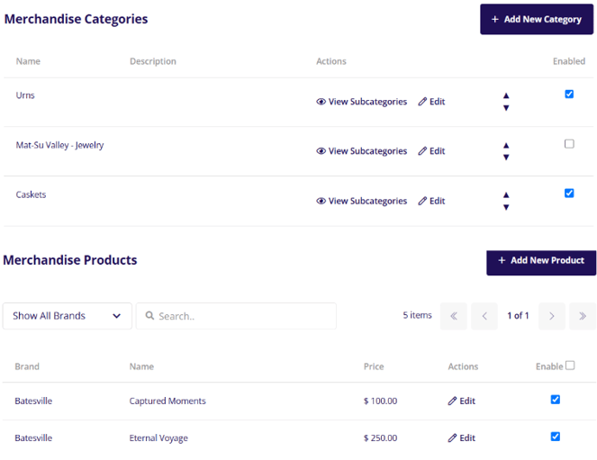Much like the merchandise pages, the merchandise categories section is where you can enable or disable certain categories and products to show in the planner. Go through the categories, subcategories and products listed and make sure to toggle the enabled checkbox on any that you want to display in this step of the online planner to be available for selection by the user.