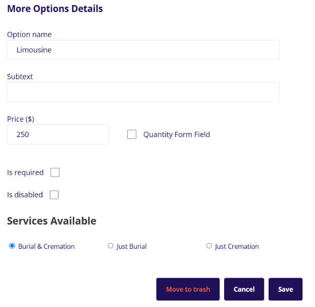 Once in the add option page, you will see the various pieces of information that can be added for the option. You can add a name for the item along with subtext if needed and a price. The quantity form field toggle will add a field on the planner for quantity of the item that the user wants. There is also toggles to make this item selection required or to disable the item from showing in the planner. Below these toggles is also a setting to toggle if this item should show up for the user based on what service type they selected in the funeral type step earlier in the planner.