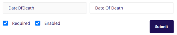 The funeral planner form fields section contains all the information entries that will display on this step for the user to enter. You can add new fields through the add new field button at the top of the section. Each field can be marked as required or not required and can also be disabled/enabled.