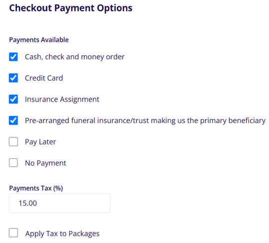 On the checkout step, this is where you will configure the various parts of the checkout page. There are a variety of options for payment that can be selected from the checkout payment options at the bottom of the page along with options for setting tax.