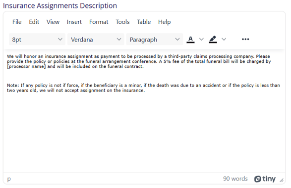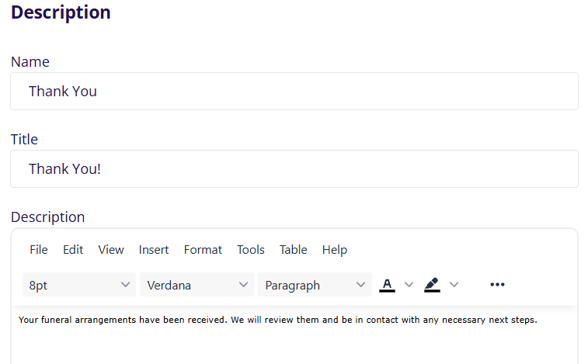 The funeral type step functions very similarly to the arrangement type step. The name, title and description that the user will see can all be customized.