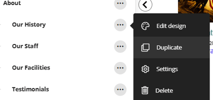 The three dots on the right side of a page or folder is where you can access the options and settings for that page. Edit design will take you to that page in the builder so you can edit the content, duplicate will make a copy of the page in the same folder, delete will delete the page from the system and settings will open up the page settings window.