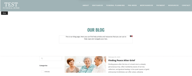 A blog page will add a page that has an editable area on the top half and a blog article area on the bottom half of the page that is not editable within the builder. The blog articles that display on the bottom half of the page are fed into this page by the blog articles added in the blog tool page in the admin dashboard. Any customization to the blog categories, information or photos showing in the articles part of the page would need to be edited from the blog tool page. The top half of the page will work as a standard page and have a fully editable content area where rows and elements can be added and edited.