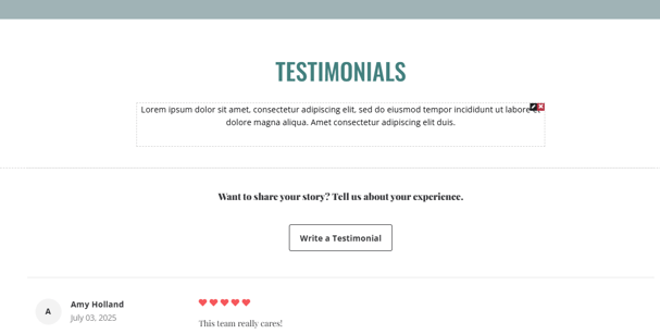 The testimonials page adds an editable content area on the top half of the page and a testimonial display section on the lower half of the page. The testimonials portion of the page is not editable within the website editor. If you need to make edits to the testimonials that are displaying, you will need to make those changes in the testimonials tool page of the admin dashboard.