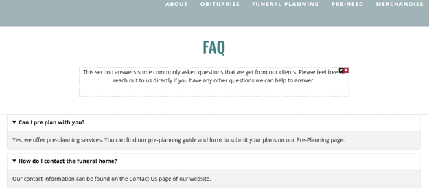 The FAQ page adds an editable content area on the top half of the page and a FAQ section on the lower half of the page. The FAQ portion of the page is not editable within the website editor. If you need to make edits to the questions or answers that display in the FAQ, you will need to make those changes in the FAQ tool page of the admin dashboard.
