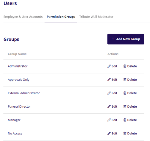 To add a custom permission group click the add new group button at the top of the section. To edit a permission group, click edit beside the permission group you want to edit.