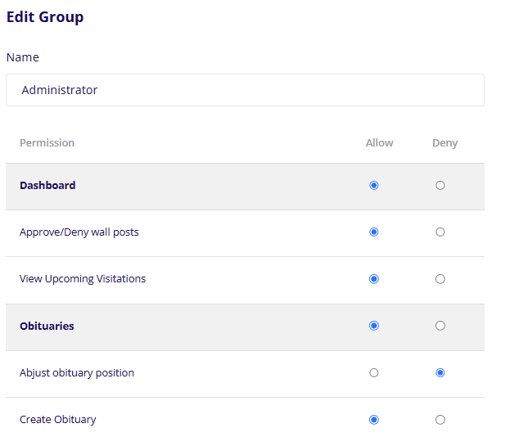 All available website permissions are listed out and broken out into sections that correspond to that permission item. The allow and deny checkboxes on the right side are what will toggle the permission to be on or off for that permission group, permission groups can also be toggle on or off as a whole. The name of the group can be changed at the top of page under the name box.