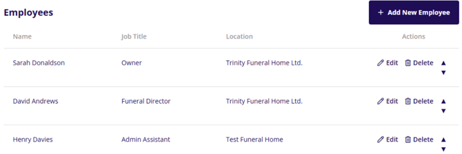 The Employees section is where all the staff members are listed. Name, Job Title and Location will be displayed along with an actions column where you have the options to edit or delete the staff member. Staff members can also be dragged and dropped to position them within the list. You can add staff members by clicking the Add New Employee button at the top of the section.