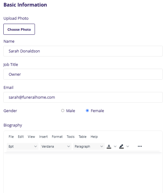 The Page Intro will display at the top of the page. This is where you can add a small write up about your staff or your funeral home to display on the page before the staff members are listed out.