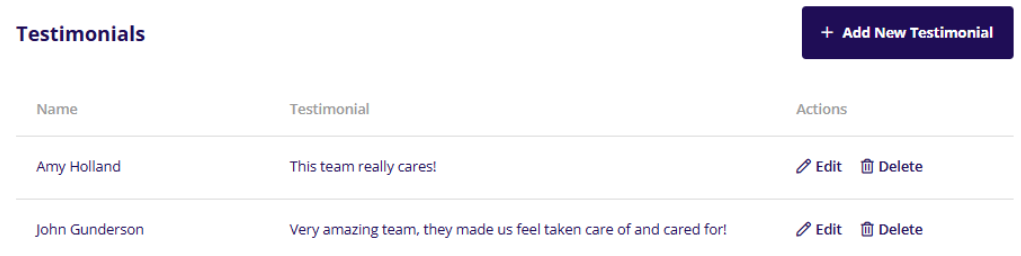Testimonials can either be manually entered from this page via the Add New Testimonial button or they can be entered by customers on the Testimonials page of the website. Testimonials listed here will show the name of the customer, a preview of the message and options to edit or delete the testimonial.