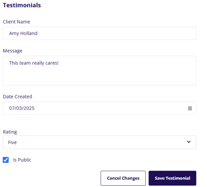 When entering or editing a testimonial, there are a few areas that can be edited. Client Name, Message, Date Created and Rating are all editable areas of the testimonial. There is also an option called Is Public that will enable the testimonial to display or not display on the testimonials page of the website. After making changes to the testimonial, make sure to click Save Testimonial at the bottom to save your changes.