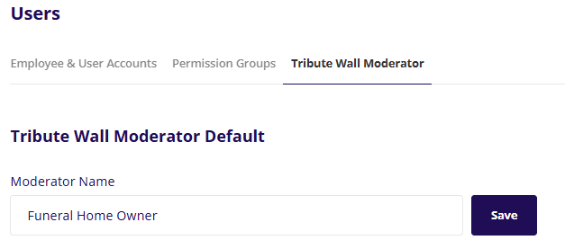 The tribute wall moderator section allows you to change the name that displays on tribute wall posts related to the funeral home staff users.