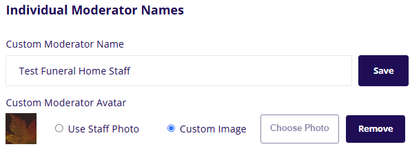 The moderator name is what will display when this employee interacts on a tribute wall and a custom photo can be set if desired. By default the staff photo that is uploaded to the employees account will be displayed if use staff photo is selected.
